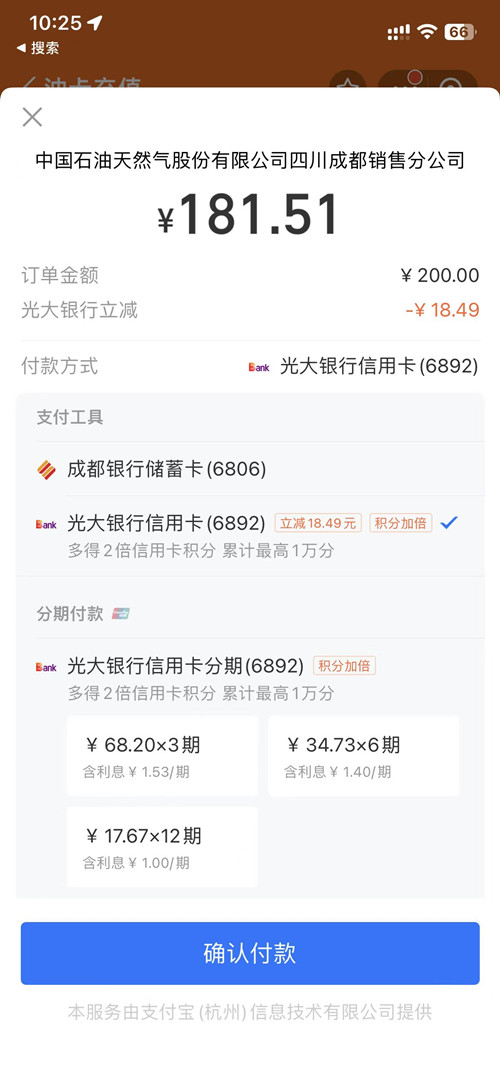 支付宝--中国石化易捷加油小程序--充值钱包-充值200元,使用光大信用卡支付,随机立减,最高18.8元;