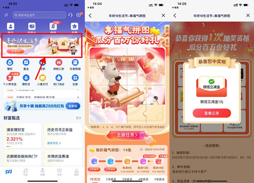 浦发银行APP最新版--点击横幅进入--简单浏览得拼图,指定数量拼图抽立减金或影音会员;