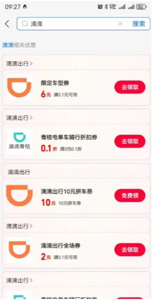 打开支付宝APP顶部搜索【消费券】进入后,再搜索【滴滴】,可以领取滴滴打车6元打车券、10元拼车券;