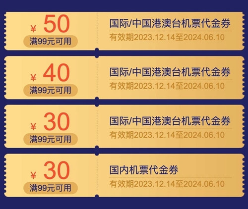 同程旅行“畅游国际”大额机票券包,含有满99元减50元、满99元减40元、满99元减30元国际/中国港澳台机票代金券、满99元减30元国内机票代金券灯。