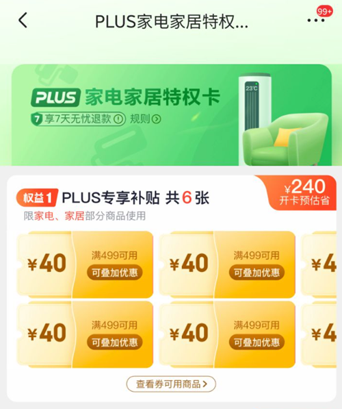 京东PLUS家电家居特权卡,9.9元购6张满499减40元补贴券