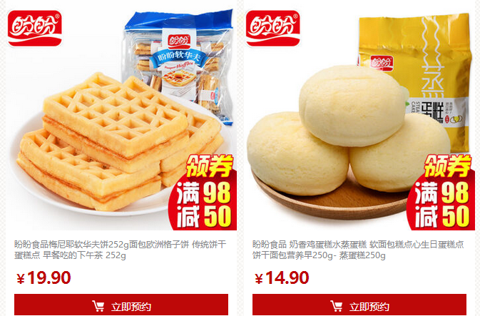 各种美味的糕点零食限时限量抢购,均满98减50元,折扣多多。