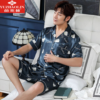 俞兆林睡衣男夏冰丝短袖薄款仿真丝绸男士睡衣短裤家居服男 墨蓝短袖 XXL