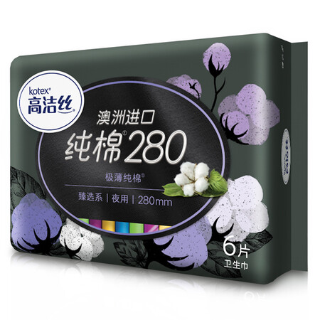 高洁丝(Kotex)臻选系列丝薄纯棉卫生巾夜用280mm6片装