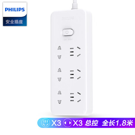 飞利浦(PHILIPS)新国标安全插座/插线板/插排/排插/接线板/拖线板 儿童保护门 全长1.8米 六位