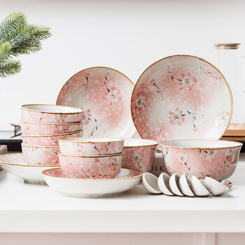 亿嘉IJARL 日式创意时尚可爱手绘家用结婚送礼陶瓷碗碟盘餐具套装 樱花18件套