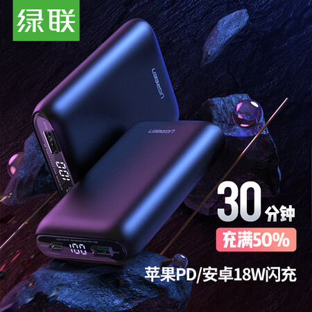 绿联 PD18W双向快充手机充电宝Type-C智能数显移动电源10000毫安大容量超薄小巧 兼容QC/FCP适用苹果华为小米