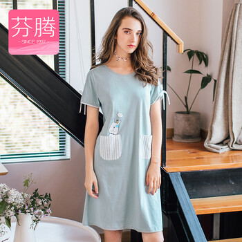 芬腾 睡衣女2018夏季新款闺蜜家居服睡裙乖巧可爱卡通蝶结睡衣套头裙装X8921817 灰绿 XL