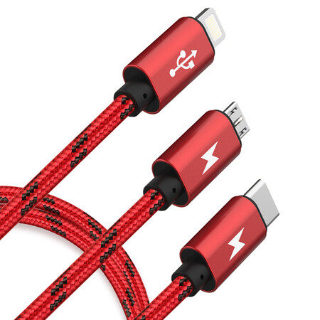 KOOLIFE 数据线三合一 3A快充线苹果安卓type-c手机充电器线 一拖三USB电源线华为小米车载iPXSMAX/8-幸运红