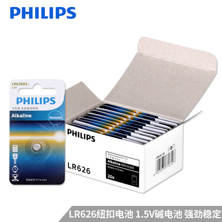 飞利浦(PHILIPS)LR626纽扣电池1.5V碱性20粒/盒通用型号SR626SW/LR66/AG4/177/377适用于手表/遥控器等