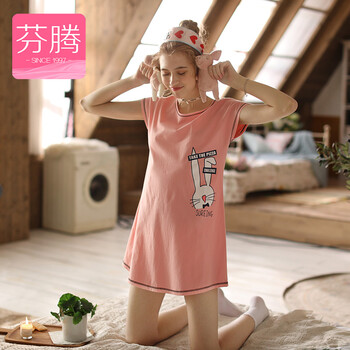 芬腾 睡衣女夏季可爱卡通印花女士精致针织棉质家居服女款睡裙J98922048 虾色 L