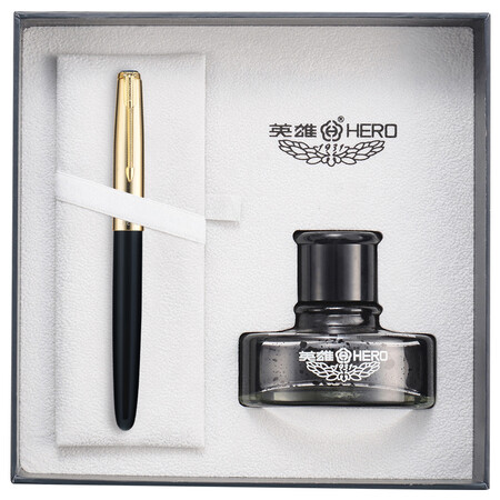 英雄(HERO)120镀金网格笔帽12K金尖钢笔墨水笔金笔墨水礼盒 黑色
