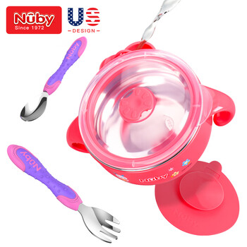 努比(Nuby)儿童餐具套装 新生儿保温碗 宝宝不锈钢餐具 婴儿辅食碗吸盘碗叉子勺子-三件套粉色