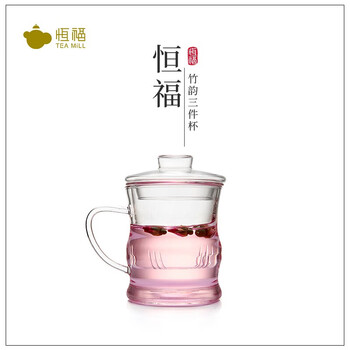 恒福 茶具杯飘逸杯耐高温玻璃带茶隔泡茶杯 便捷式办公个人喝茶杯子带盖 竹韵三件杯