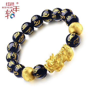 红色年轮 黄金貔貅手链3D硬金足金六字真言转运珠黑玛瑙手串 配10mm六字玛瑙珠 总金重约3.8g