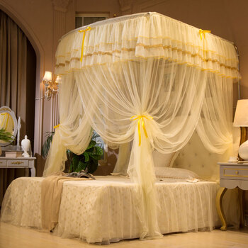 迎馨家纺 钓鱼竿三开门蚊帐 伸缩宫廷蚊帐U型支架32立柱加粗1.8m床 米黄色