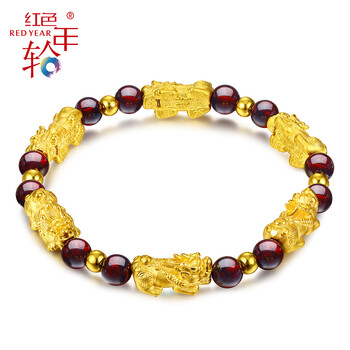 红色年轮 3D硬金貔貅手链男女款 足金黄金路路通转运珠石榴石手串